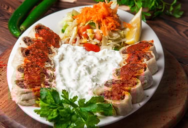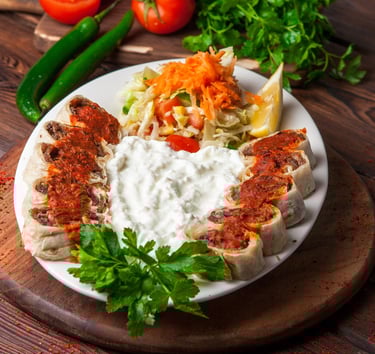 Adana kebab enroulé dans une fine galette, nappé de sauce tomate et yaourt.